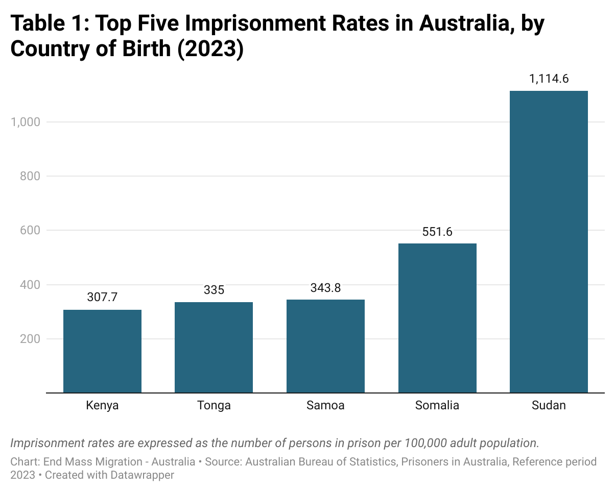 Foreign born nationals from Sudan and Somalia have significantly higher imprisonment rates than Australian born. They have the highest imprisonment rates of all foreign-born nationals (see Table 1 below). Yet they comprise less than 1% of the Australian population.